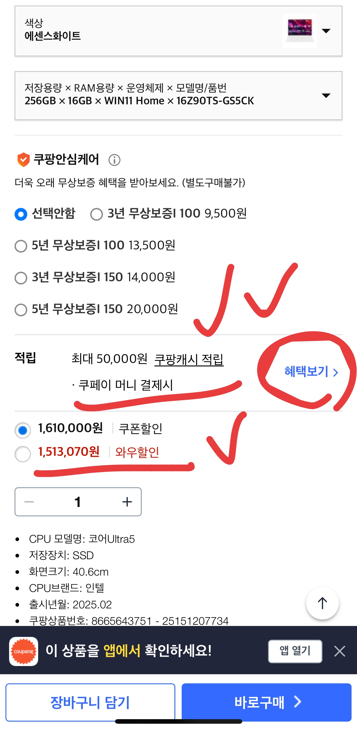 - '쿠페이 머니'로 결제하여 5만 원 캐시백 확정: 결제 단계에서 쿠페이 머니로 결제하면, 구매 확정 후 최대 50,000원이 적립됩니다. 상품 페이지에서 혜택 보기 버튼을 눌러 정확한 적립액을 미리 확인하세요.