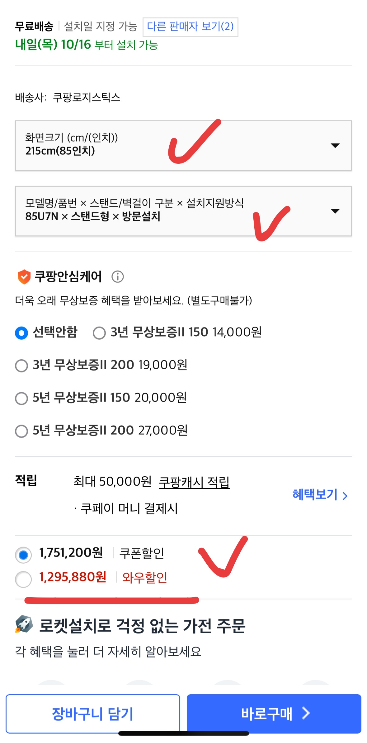 구매 전, TV가 설치될 공간의 가로와 세로 길이를 반드시 실측해야 합니다. 또한 TV가 들어올 현관문, 복도, 엘리베이터의 공간도 미리 확인하는 것이 좋습니다. '로켓설치'가 모든 것을 도와주지만, 물리적으로 진입이 불가능하면 안 되니까요.