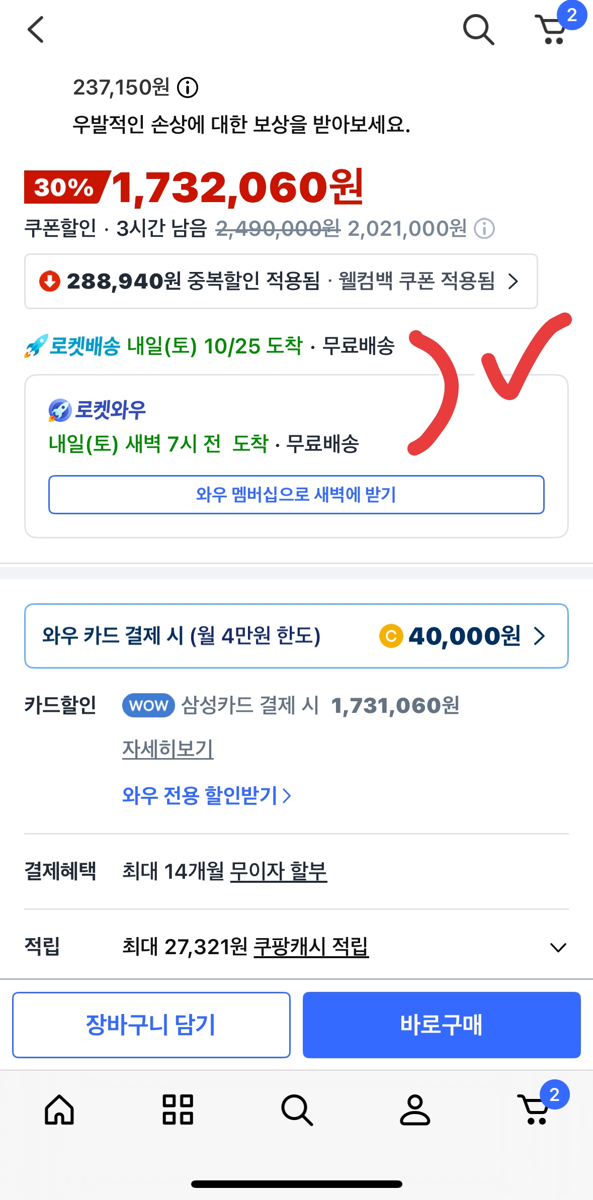 - 만약 와우 멤버십에 처음 가입하거나, 이미지처럼 '웰컴백 쿠폰' 등 특정 타겟에 해당한다면 1,732,060원이라는 더 낮은 가격이 적용됩니다.