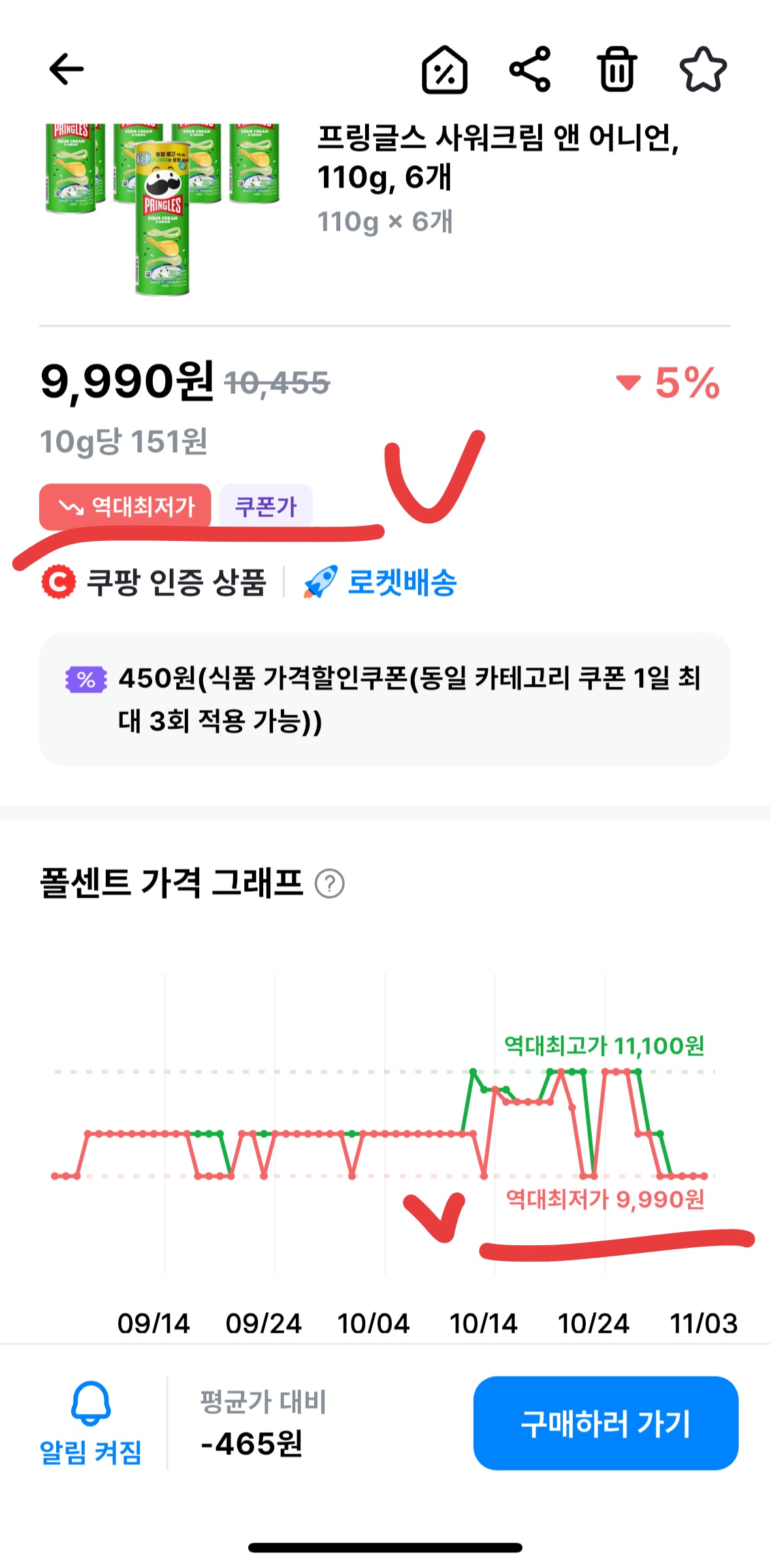 - 최종 혜택가 9,990원은 그래프상 '역대 최저가'와 동일한 가격입니다.