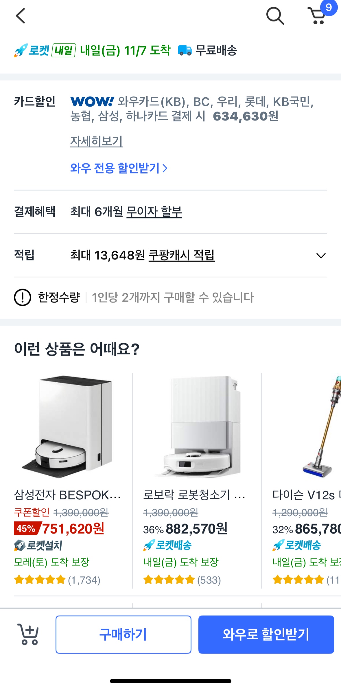 청소는 이제 다이슨에게 맡기시고, 당신의 소중한 시간을 확보하세요. 와우 회원 가입 여부와 할인 적용 카드를 꼭 확인하신 후, 한정 수량이 끝나기 전에 빠르게 탑승하시길 바랍니다.