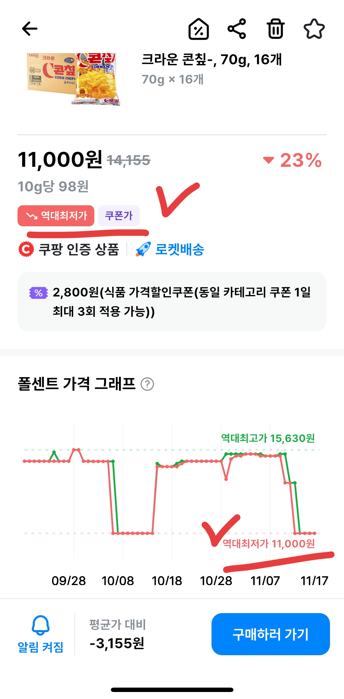 이전 역대 최저가 11,000원 약 98원 그래프상 확인된 최저가입니다.