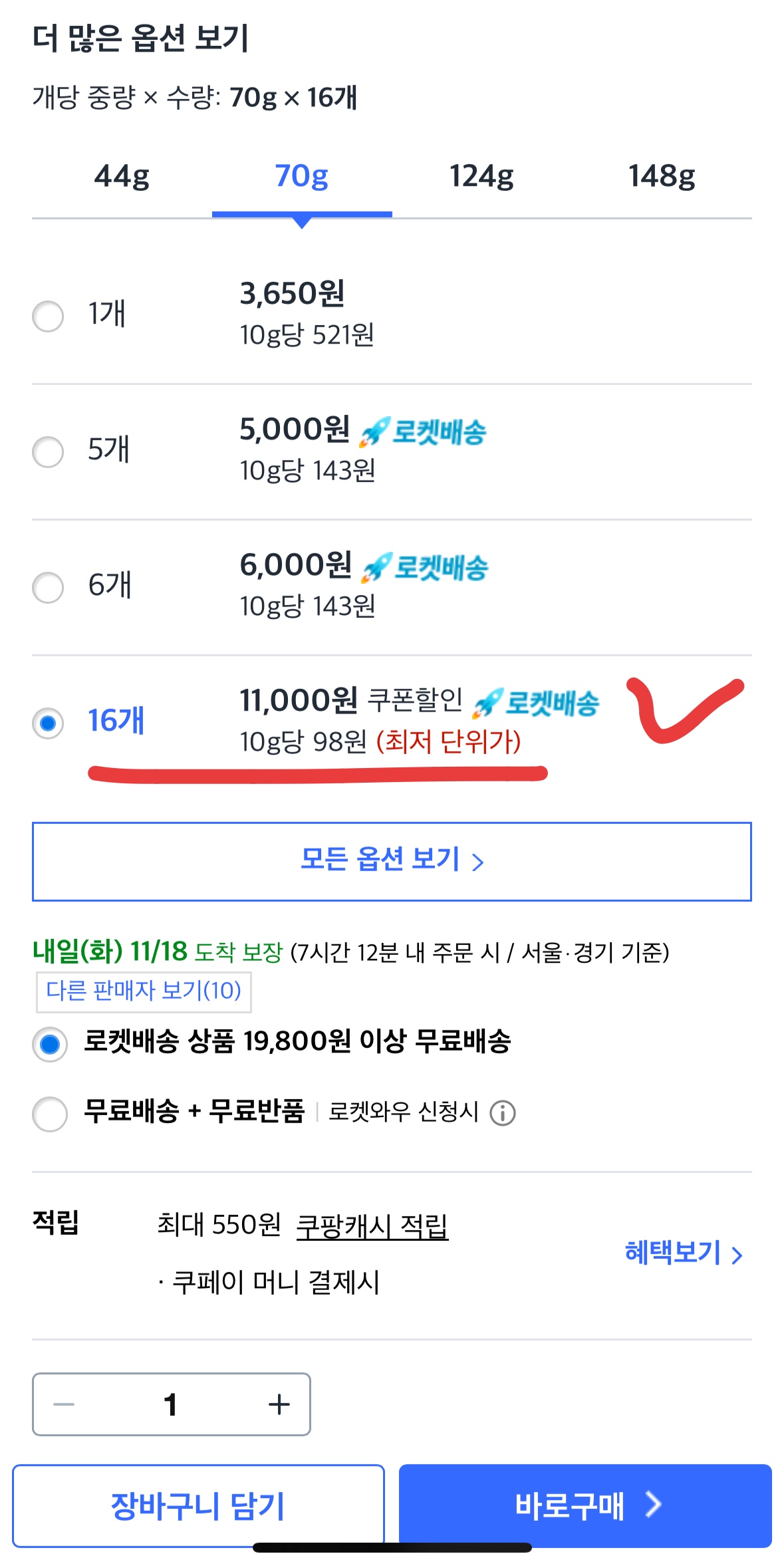 2. 로켓배송: 배송비 걱정 없이 내일 바로 받을 수 있습니다. (와우 회원 기준)