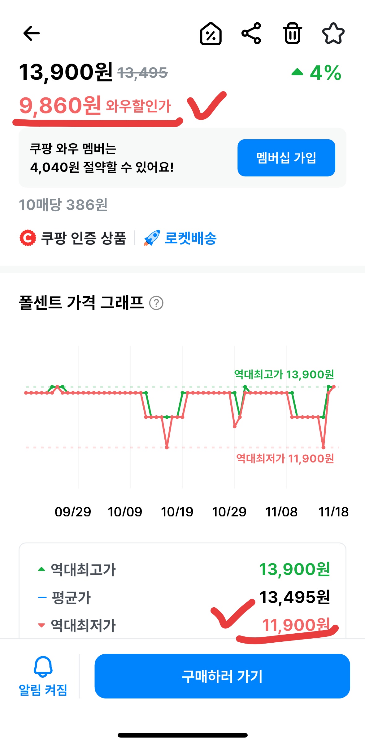 이전 역대 최저가였던 11,900원보다 더 저렴한 9,860원입니다.