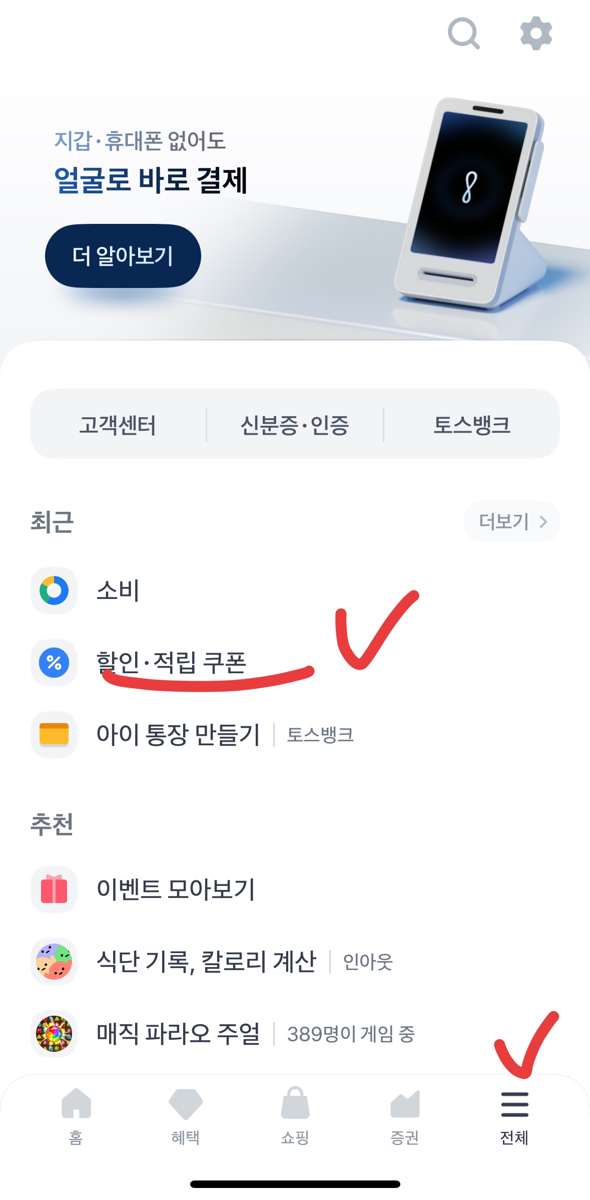 1. 토스 앱 접속 및 혜택 찾기 토스 앱을 켜고 우측 하단 [전체] 메뉴를 누른 뒤, [할인·적립 쿠폰] 메뉴를 찾아주세요.