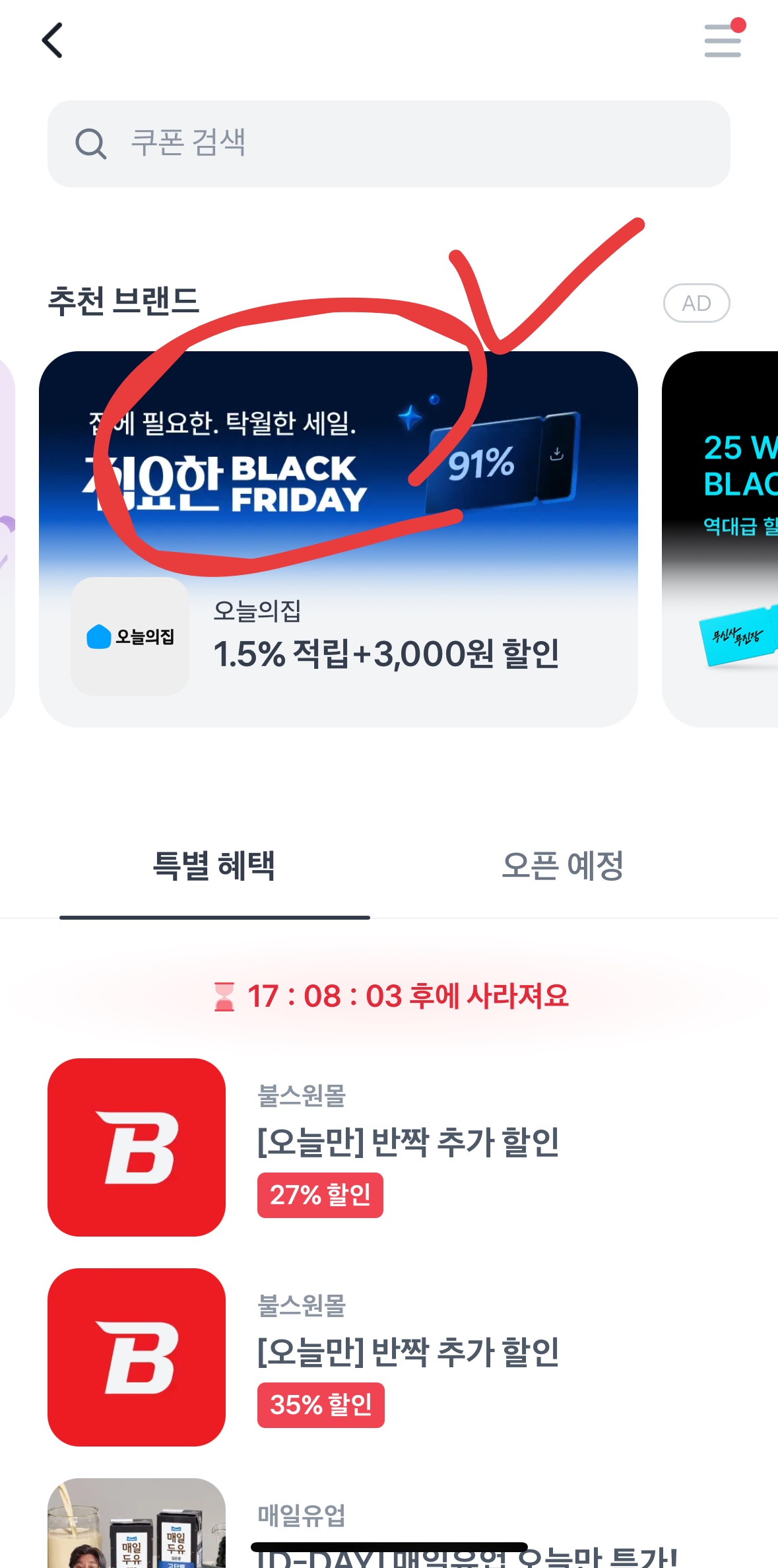 2. 오늘의집 혜택 배너 클릭 스크롤을 내려 [오늘의집 1.5% 적립 + 3,000원 할인] 혹은 [집요한 블랙 프라이데이] 배너를 찾아서 클릭합니다. 이 배너를 통해야만 히든 혜택이 적용됩니다.