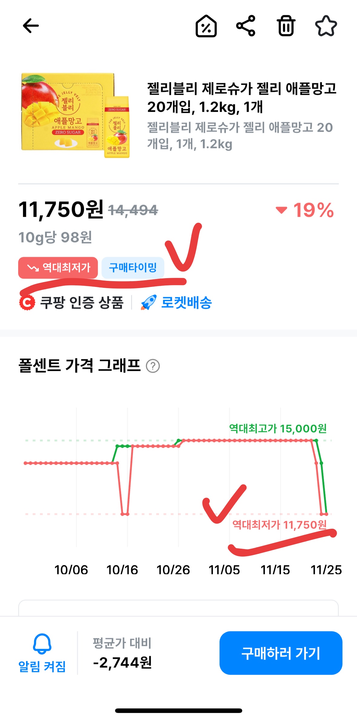 보시다시피 지금 역대 최저가인 11,750원을 찍었습니다. 정가 대비 약 19% 이상 저렴하며, 10g당 100원 밑으로 떨어졌다는 건 '쟁여둘 타이밍'이라는 강력한 신호입니다.