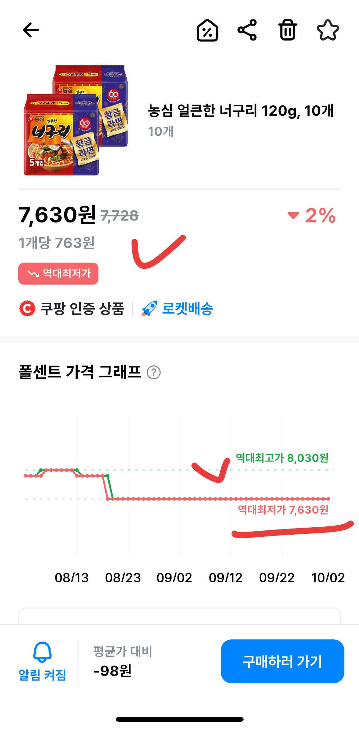 | 이전 역대 최저가 | 7,630원 | 763원/개 | 기록과 타이를 이루는 역대급 가격. |