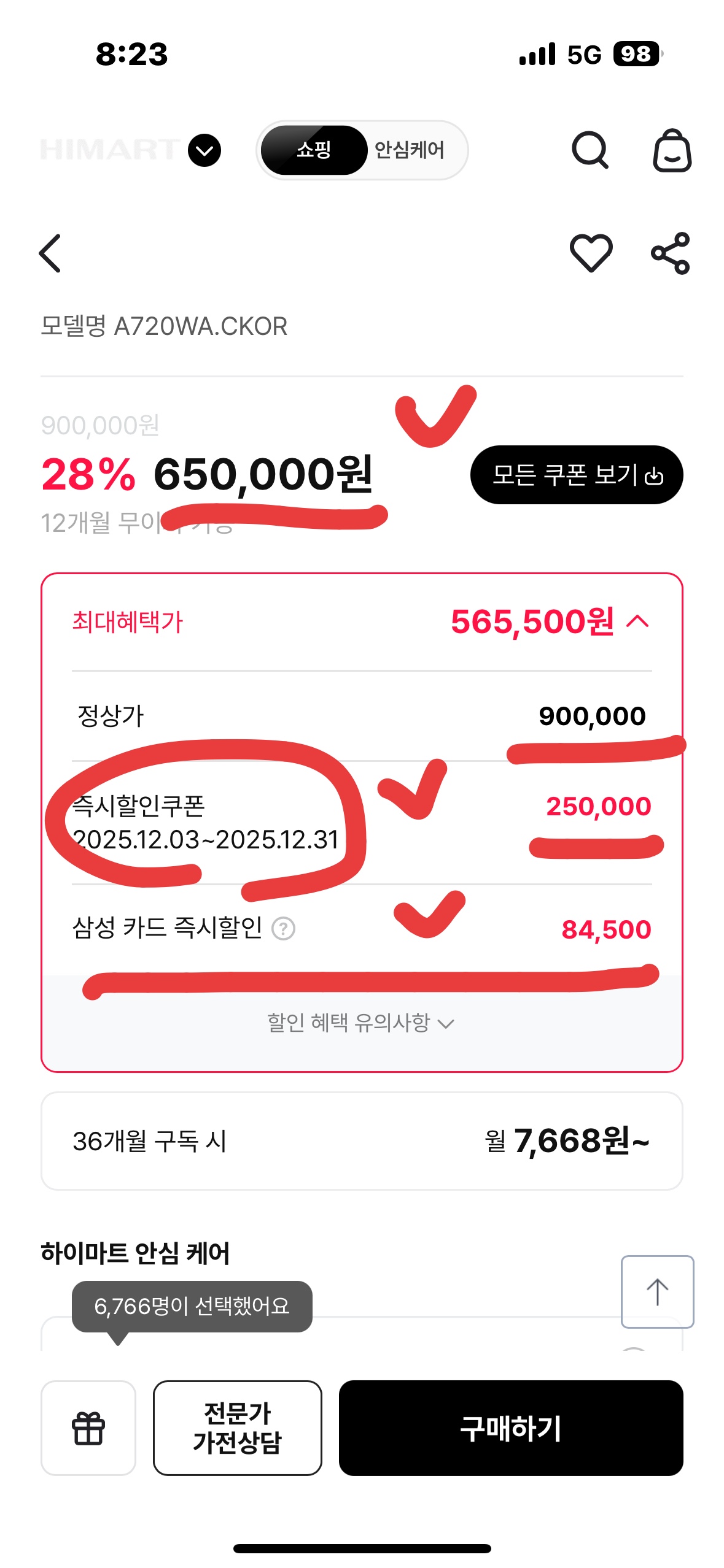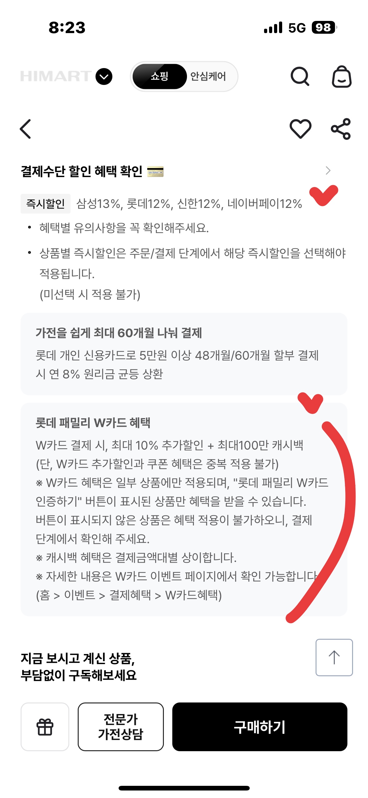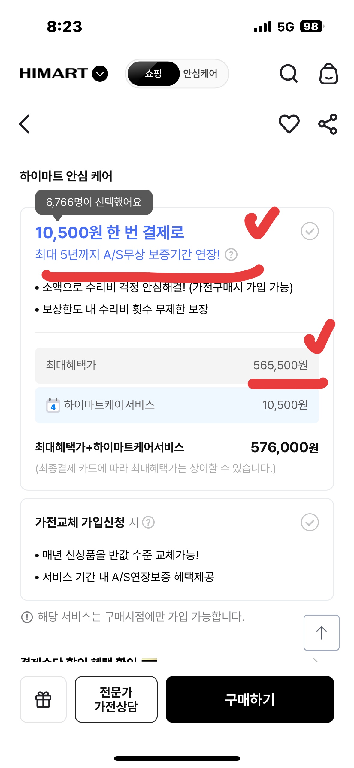 이 딜을 추천하는 또 다른 이유는 하이마트 안심 케어입니다. 결제 단계에서 단돈 10,500원만 추가하면, A/S 무상 보증 기간이 최대 5년까지 연장됩니다.