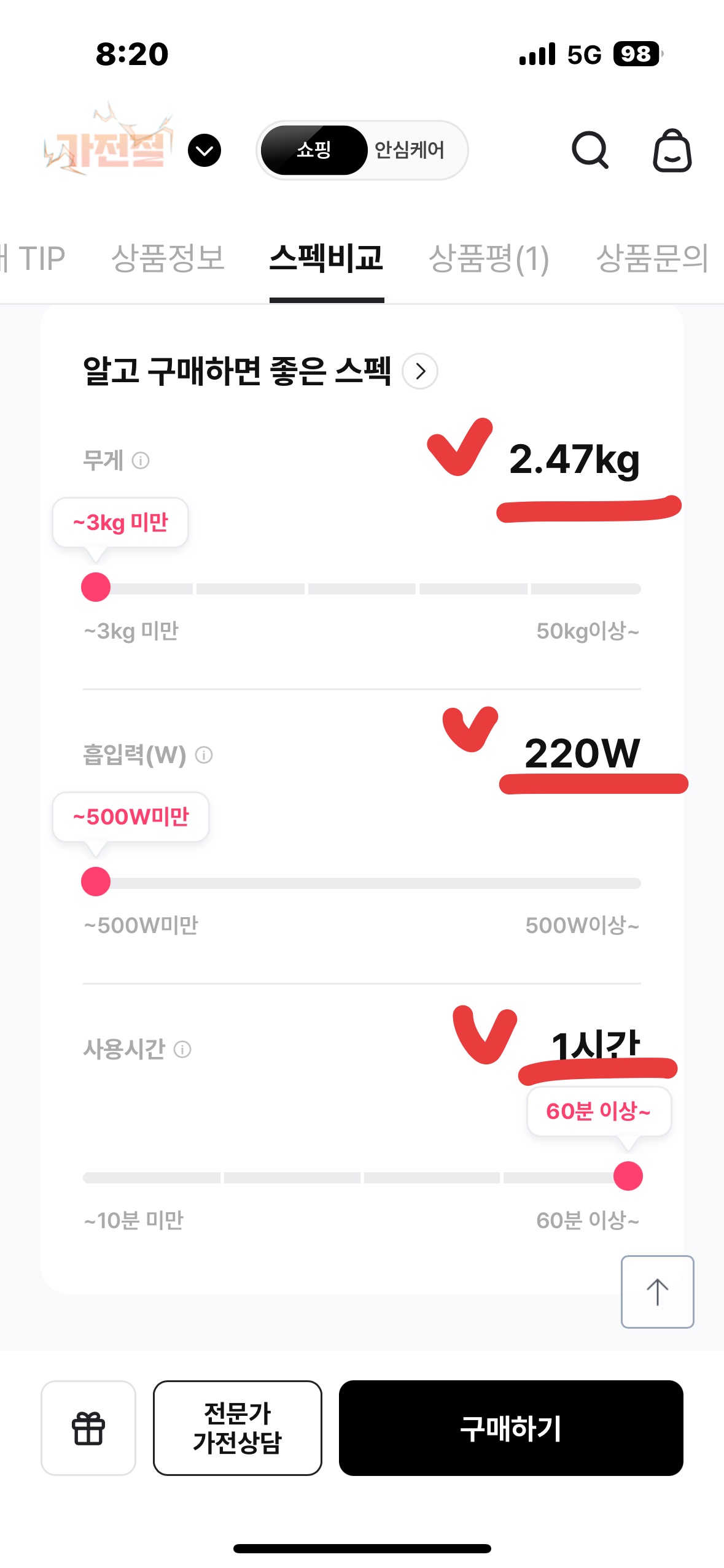 - 무게 2.47kg: 손목 부담이 확 줄어드는 '3kg 미만' 구간입니다. 매일 청소기를 돌려야 하는 가정에서는 이 500g의 차이가 큽니다.