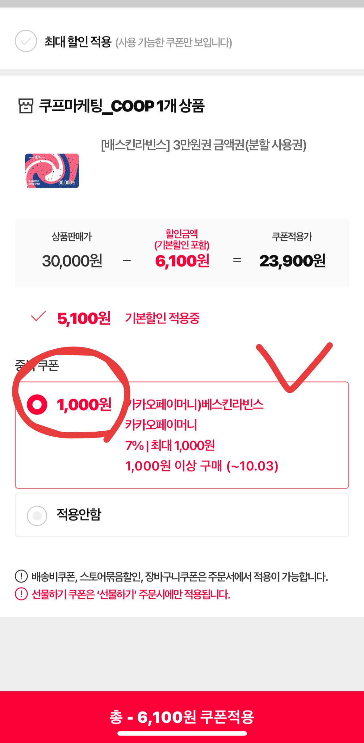 - 배스킨라빈스 3만 원권을 최종 혜택가 23,900원(20.3% 할인)에 구매할 수 있습니다.