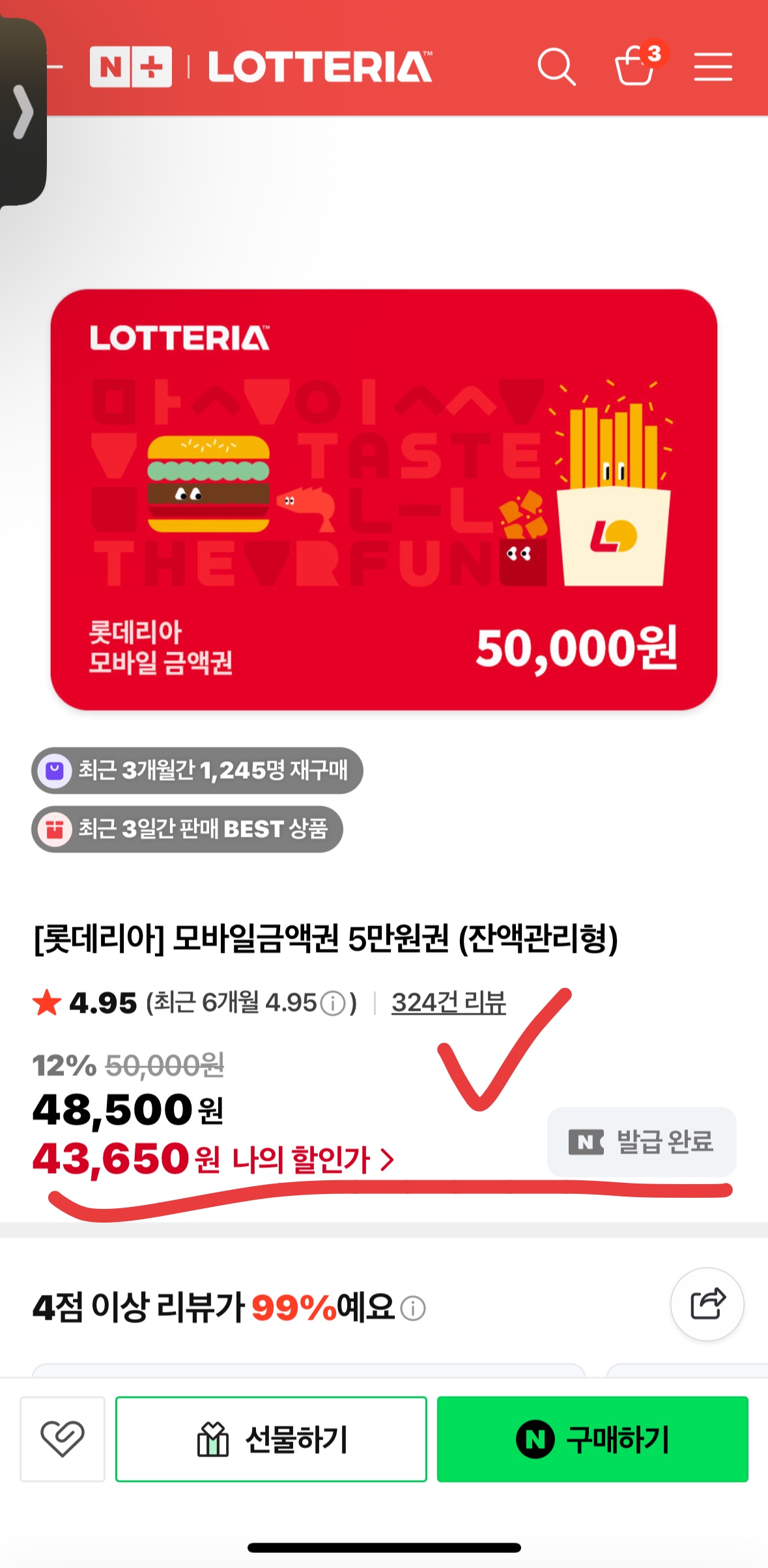 [핫딜+] 롯데리아 5만 원권 43,650원 역대급 핫딜