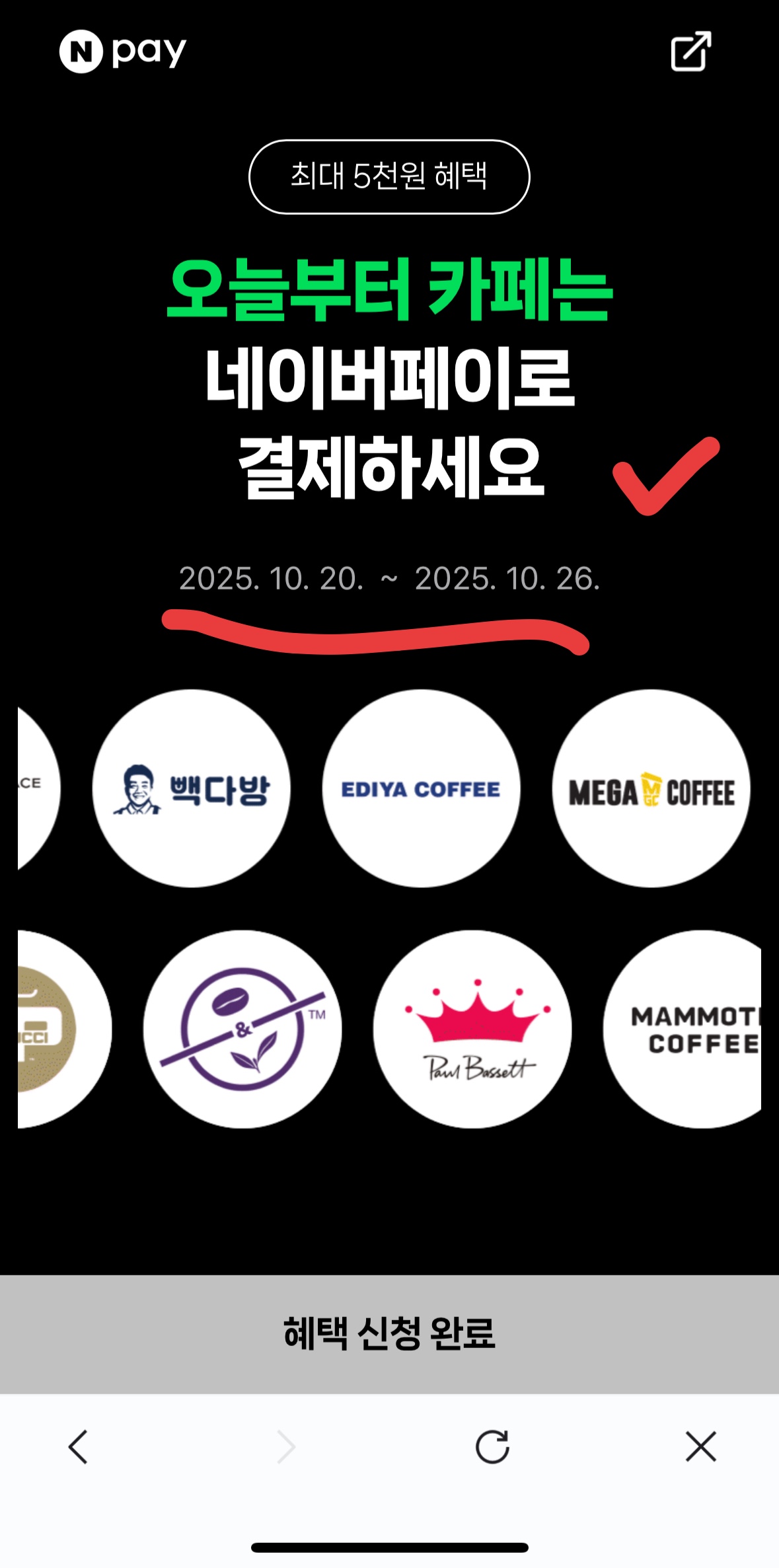 안녕하세요, 사이버 보부상 김 과장입니다. 이번 주에도 네이버페이 카페 이벤트가 계속됩니다. 이제는 선택이 아닌 필수인 커피값 절약 방법, 핵심만 빠르게 다시 알려드립니다. 아래 내용만 숙지하셔도 이번 주 커피값 최소 3,500원에서 최대 5,000원까지 아낄 수 있습니다. 이번 주 네이버페이 혜택 총정리 이벤트 기간: 2025년 9월 22일(월) ~ 9월 28일(일)최대 혜택: 네이버페이 현장 결제 첫 이용자: 최대 5,000원 적립 기존 이용자: 최대 3,500원 적립 참여 대상 카페: 메가 MGC 커피, 컴포즈커피, 빽다방, 이디야커피, 투썸플레이스, 커피 빈 등 10개 프랜차이즈 적립 실패 막는 필수 조건 3가지 1. '혜택 신청하기' 먼저 누르기 결제하기 전, 네이버페이 이벤트 페이지에서 반드시..