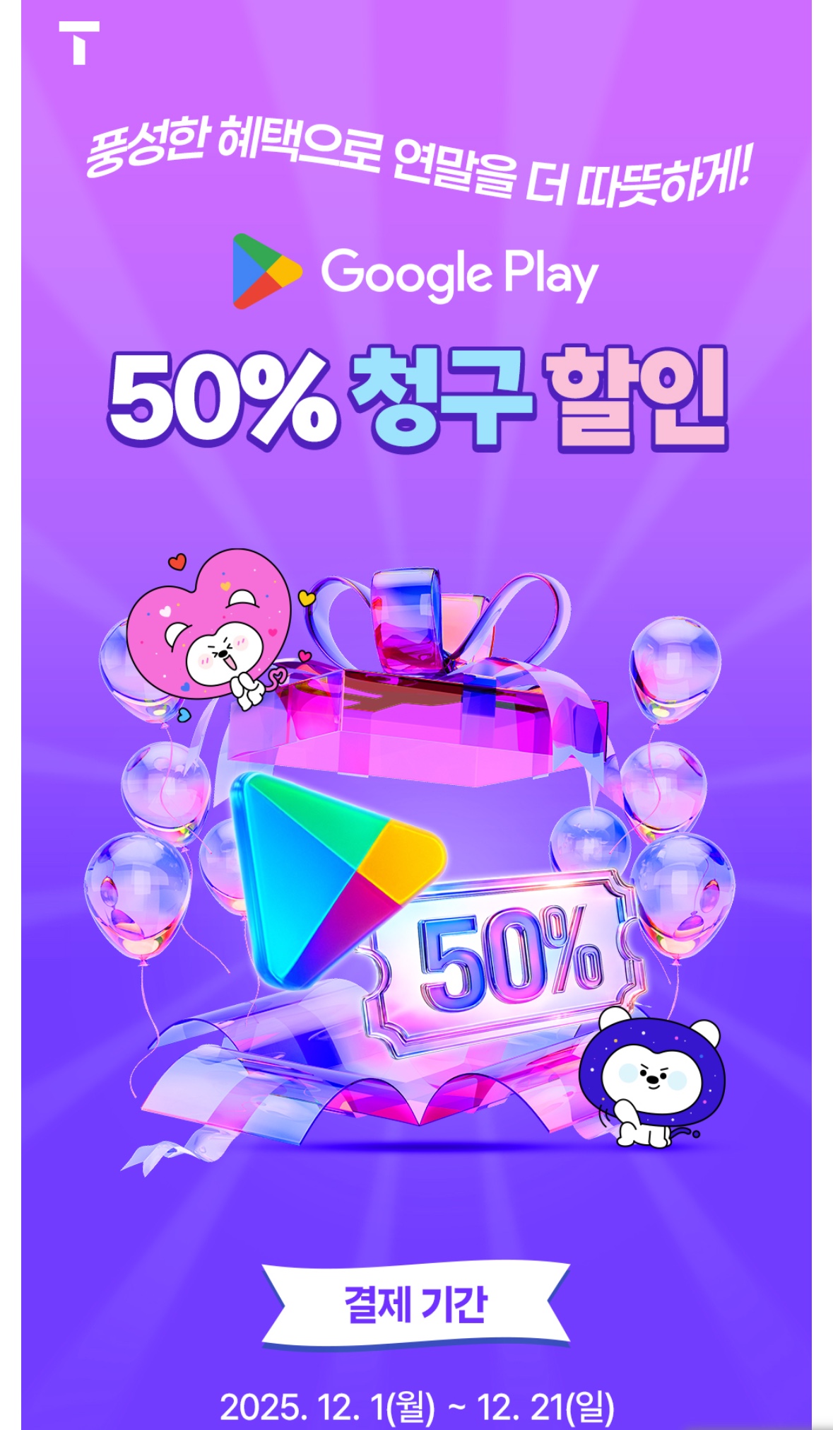 안녕하세요, 사이버 보부상 김 과장입니다.당신이 모바일 게임을 즐기거나 구글 플레이에서 유료 앱을 결제한다면, 이번 12월은 절대 그냥 지나쳐선 안 됩니다. SKT에서 연말을 맞아 공격적인 프로모션을 시작했기 때문입니다.오늘 소개할 정보는 단순한 할인이 아닙니다. 쓰는 돈의 절반을 통신사가 대신 내주는 파격적인 혜택입니다. ▼ 바쁘면 최종 결론부터 확인하기 ▼ 오늘의 핫딜: SKT 구글 결제 50% 페이백 많은 분들이 휴대폰 결제를 무심코 사용하지만, 이번 이벤트 기간만큼은 전략적으로 사용해야 합니다.기간: 2025년 12월 1일 ~ 12월 21일조건: 이벤트 페이지 참여 인증 + SK Telecom 결제 수단 이용혜택: 최대 20,000원 청구 할인 (50%) 심층 가성비 분석데이터로 증명..